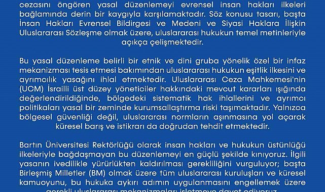 Açıklamada, "Bartın Üniversitesi (BARÜ) Rektörlüğü, İsrail tarafından Filistinlilere yönelik idam cezasını öngören yasal düzenlemeyi evrensel insan hakları ilkeleri bağlamında derin bir kaygıyla karşılamaktadır. Söz konusu tasarı, başta İnsan Hakları Evrensel Bildirgesi ve Medeni ve Siyasi Haklara İlişkin Uluslararası Sözleşme olmak üzere, uluslararası hukukun temel metinleriyle açıkça çelişmektedir.
