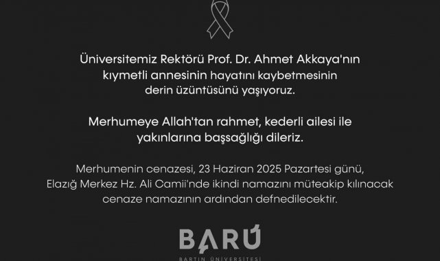 Bartın Üniversitesi (BARÜ) resmi hesabı üzerinden annesini kaybeden Rektör Prof. Dr. Ahmet Akkaya için taziye mesaj yayımlandı.