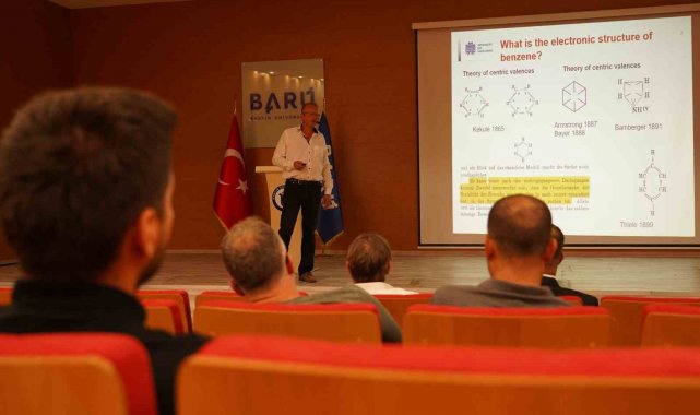 Çevreye zararsız bir şekilde küçük molekülleri çeşitli hammaddelere dönüştürmeyi hedefleyen projenin yıllık toplantısı kapsamında BARÜ'ye gelen Prof. Dr. David Scheschkewitz ve Prof. Dr. Dominik Munz ilk olarak Rektör Prof. Dr. Ahmet Akkaya, Rektör Yardımcısı Prof. Dr. Selçuk Gümüş ile bir araya geldi. Rektör Akkaya, proje ekibiyle gerçekleştirdiği görüşmede Prof. Dr. Yıldız ve tüm proje ekibine çalışmalarında başarılar dileyerek çevre dostu bilimsel çalışmalara olan desteğini vurguladı. Ziyaretlerinin ardından Prof. Dr. Scheschkewitz ve Prof. Dr. Munz, Merkezi Araştırma Laboratuvarı Söyleşileri programı kapsamında inorganik kimya ve çeşitli teoriler hakkında bilimsel sunumlarda bulundu. Prof. Dr. Scheschkewitz "Hückel Aromatiklerinin Silisyum Türevleri", Prof. Dr. Munz ise "Metal Nitrenler, Fosfinidenler ve Karbinler" başlıklarında katılımcılara bilgiler aktardı.