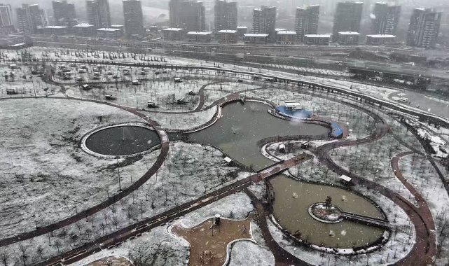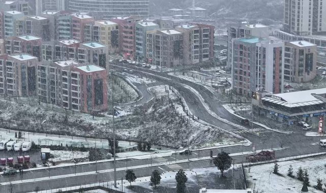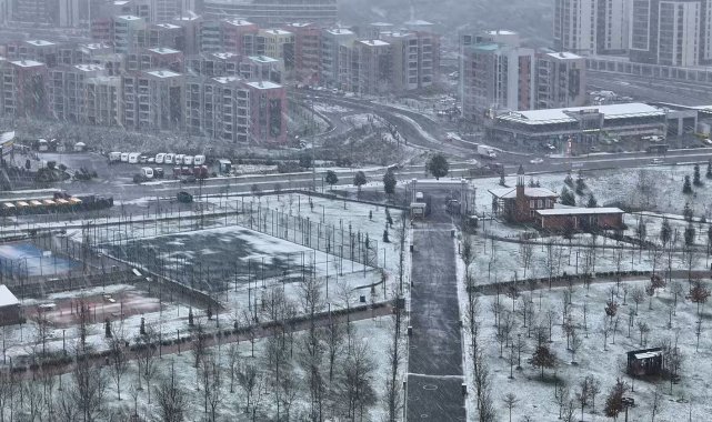 İstanbul'un Başakşehir ilçesinde lapa lapa yağan kar havadan görüntülenirken kartpostallık manzaralar oluştu.