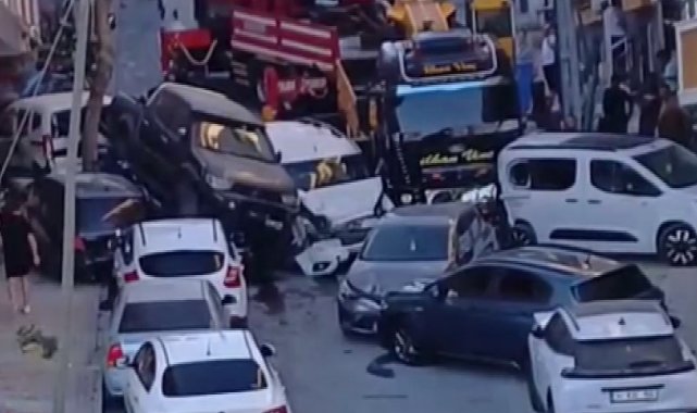 Başakşehir'de bir inşaat alanına kurulan vinç, yokuşta kontrolden çıkarak kaydı. Yokuş aşağı hızla ilerleyen vinç, park halindeki 23 araca çarptı. Savrulan araçlardan bazıları çevredeki binaların dış cephesine çarptı. O anlar kameraya yansıdı.