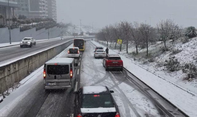 Beyaza bürünen Başakşehir'de araç sürücüleri ilerlemekte zorluk çekti. Bazı otomobiller yolda kalırken o anlar havadan görüntülendi.