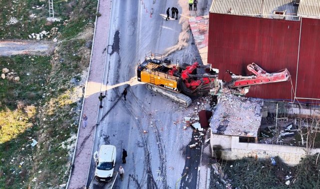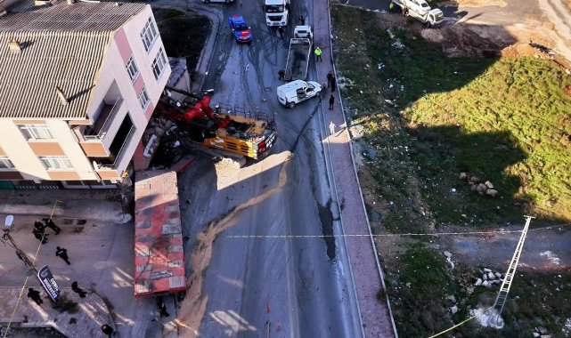 Başakşehir'de iş makinesinin çektiği tırın arkasında taşınan bir vinç düşerek 2 araca ve bir binaya çarptı. Bina tahliye edilirken, kaza anı saniye saniye güvenlik kamerasına yansıdı. Bina ve olay yeri havadan görüntülendi.
