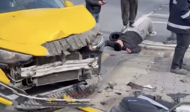 Başakşehir'de taksi ile çarpışan motosiklet sürücüsünün savrularak yaralandığı kaza anı güvenlik kamerasına yansıdı.