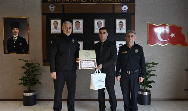 DÜZCE (İHA) – Düzce İl Emniyet Müdürü İbrahim Ergüder, ocak ayında görevlerinde üstün başarı ve özveri gösteren emniyet personeline teşekkür belgesi ve çeşitli hediyeler takdim etti.
