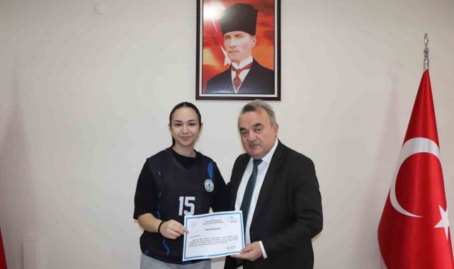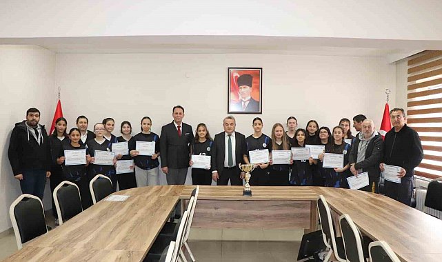 Bozüyük Kaymakamı Adem Öztürk, Okul Sporları Yıldız Kızlar Basketbol İl Birincisi sporculara belgelerini verdi.