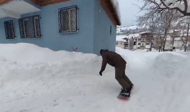 Tokat'ın Başçiftlik ilçesinde kar yağışının ardından snowboardla sokağa çıkan dayı-yeğen, ilçe merkezini kayak pistine çevirerek renkli görüntülere imza attı.