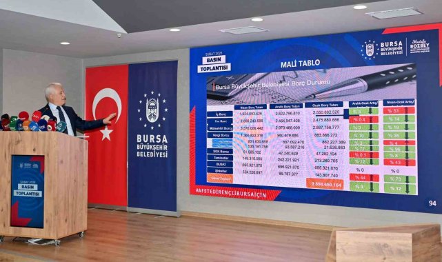 Mali tabloyla ilgili bilgilerde veren Başkan Bozbey, Büyükşehir Belediyesi'nin Ocak ayında borcunun 9 milyar civarına düştüğünü belirtti. Nisan ile Ocak ayı arasında borcu yüzde 11 civarında azalttıklarını anlatan Başkan Bozbey, "BUSKİ'nin borcu Nisan ayına göre yüzde 38 civarında artmış durumda. Şirketlerin borçlarında da yüzde 19 civarında düşüş var. Döviz cinsinden borçlarımız da 827 milyon dolara düşmüş durumda. Büyükşehir Belediyesi'nin iç borcunda yüzde 33 civarında artış var. Dış borcunda yüzde 14 civarında azalma var. Müteahhit borçları düşmüş durumda. Şeffaf bir yönetim oluşturduk. Her konuyu kamuoyuyla paylaşacağız. Doğru bildiğimizin arkasında durmaya devam edeceğiz" diye konuştu.