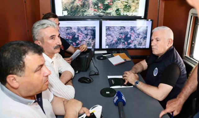 Bursa'nın Harmancık ilçesindeki yangın akşam saatlerinde yeniden alevlenirken, Bursa Büyükşehir Belediyesi itfaiye teşkilatı başta olmak üzere Orman Bölge Müdürlüğü, kamu kurumları, büyükşehir belediyeleri, ilçe belediyeleri, sivil toplum kuruluşları ve vatandaşların iş birliğiyle söndürme çalışmaları aralıksız sürdürülüyor. Bursa Büyükşehir Belediye Başkanı Mustafa Bozbey de beraberindeki CHP İl Başkanı Nihat Yeşiltaş, CHP Bursa Milletvekili Hasan Öztürk ve belediye yöneticileriyle birlikte Harmancık ilçesine geçerek çalışmaları yerinde inceledi. Sahada gece gündüz demeden görev alan ekiplere kolaylıklar dileyen Başkan Bozbey, AKOM aracına geçerek drone aracılığıyla alanı gözlemledi ve son durum hakkında bilgi aldı.