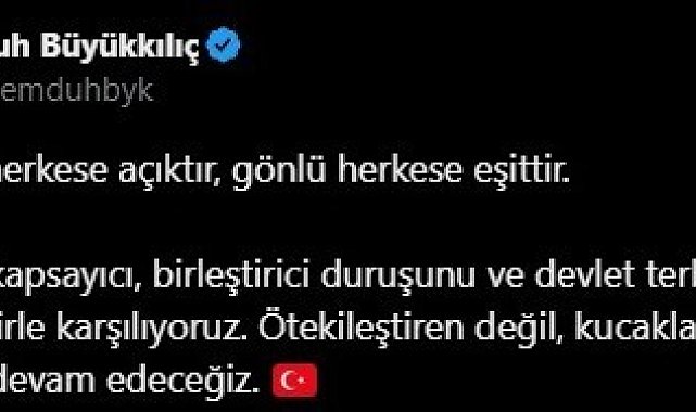Başkan Büyükkılıç paylaşımında, "Devletin kapısı herkese açıktır, gönlü herkese eşittir. Sayın Valimizin kapsayıcı, birleştirici duruşunu ve devlet terbiyesine yakışır yaklaşımını takdirle karşılıyoruz. Ötekileştiren değil, kucaklayan bir anlayışla hizmet etmeye devam edeceğiz" ifadelerine yer verdi.