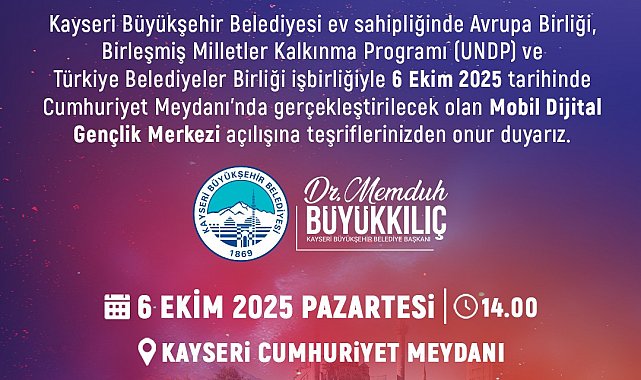 Kayseri Büyükşehir Belediye Başkanı Dr. Memduh Büyükkılıç; "Avrupa Birliği desteğiyle hayata geçirilen ve bilimle teknolojiyi gençlerimizin ayağına götürecek olan Mobil Dijital Gençlik Merkezimizin açılışını, 6 Ekim Pazartesi günü Cumhuriyet Meydanı'nda gerçekleştiriyoruz. Tüm hemşehrilerimizi bu gurur verici güne ortak olmaya davet ediyorum" dedi.