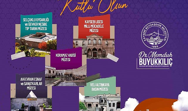 Kayseri Büyükşehir Belediye Başkanı Dr. Memduh Büyükkılıç, müzeler şehir Kayseri'de Büyükşehir Belediyesi'ne ait müzelerin ücretsiz olacağını belirterek, 18-24 Mayıs Müzeler Haftası'nı kutladı.