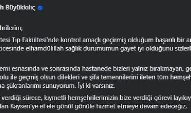"Kıymetli hemşehrilerim; Erciyes Üniversitesi Tıp Fakültesi'nde kontrol amaçlı geçirmiş olduğum başarılı bir anjiyografi operasyonu neticesinde elhamdülillah sağlık durumumun gayet iyi olduğunu sizlerle paylaşmak istiyorum. Gerek anjiyo işlemi esnasında ve sonrasında hastanede bizleri yalnız bırakmayan, gerekse telefon ve sosyal medya yolu ile geçmiş olsun dilekleri ve şifa temennilerini ileten tüm hemşehrilerime ve tüm gönül dostlarıma şükranlarımı sunuyorum. İyi ki varsınız. Rabbimiz ömür verdiği sürece, kıymetli hemşehrilerimizin bize verdiği görevi layıkıyla sürdürmek için sevdamız olan Kayseri'ye el ele gönül gönüle hizmet etmeye devam edeceğiz."
