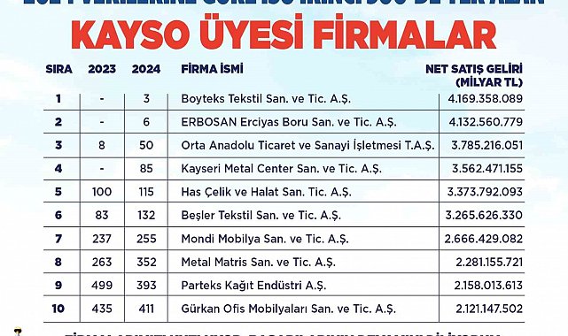 "Sanayi ve ticaretin kadim merkezi olan Kayseri'mizin başarılarıyla gurur duyuyoruz. Türkiye'nin Üretim Üssü Kayseri'mizden gururlandıran başarı. İstanbul Sanayi Odası'nın 2024 verilerine göre İkinci 500 listesinde yer alan 10 değerli firmamızı yürekten kutluyorum. Her biri şehrimizin üretim gücünü, ihracat potansiyelini ve sanayi vizyonunu temsil ediyor. Bu başarıda emeği geçen tüm çalışanlarımızı ve yöneticilerimizi tebrik ediyor, şehrimize katma değer sağlayan bu kıymetli firmalarımızın başarılarının devamını diliyorum."
