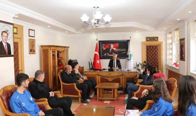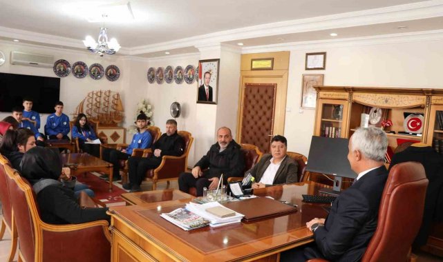 Oltu Belediye Başkanı Adem Çelebi, bölge birincisi olan Oltu ilçesi Yusuf Ziya Bey Anadolu Lisesi Genç A Floor Curling takımını makamında kabul etti.
