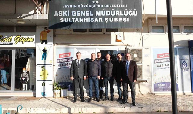 Aydın Büyükşehir Belediyesi Su ve Kanalizasyon İdaresi (ASKİ) Genel Müdürü Hakan Olkaç, Genel Sekreter Yardımcısı Zafer Uçar ve Fen İşleri Dairesi Başkanı Ufuk Serdar Özmen, Sultanhisar Belediye Başkanı Osman Yıldırımkaya'yı ziyaret ederek Aydın Büyükşehir Belediye Başkanı Özlem Çerçioğlu tarafından Sultanhisar ilçesine gerçekleştirilen yatırım ve çalışmaları değerlendirdi.