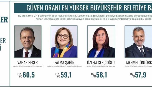 Türkiye genelinde yapılan araştırmada, Aydın Büyükşehir Belediye Başkanı Özlem Çerçioğlu yüzde 58,1'lik oranla en güvenilen üçüncü büyükşehir belediye başkanı oldu.