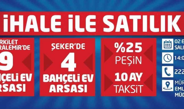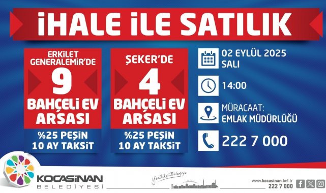 Öte yandan Kocasinan ilçesinde bulunan arsalar ihale ile satışa sunulacak. Erkilet Generalemir Mahallesi'nde 9 adet, Şeker Mahallesi'nde ise 4 adet bahçeli ev arsası yüzde 25 peşinat ve 10 ay taksit imkânıyla ihaleye çıkarılacak. İhaleye katılmak isteyenler, ihale şartnamesi ve eklerini Emlak Müdürlüğü'nden temin edebilecekleri gibi, ayrıca 0 (352) 222 70 00 numaralı telefondan ayrıntılı bilgi alabilecek.