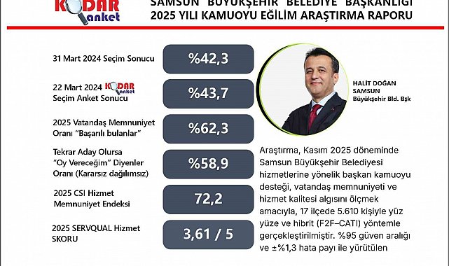 KODAR Anket, "Samsun Büyükşehir Belediye Başkanlığı 2025 Yılı Kamuoyu Eğilim Araştırma Raporu"nu paylaştı. Kasım 2025 döneminde gerçekleştirilen araştırmaya göre, Samsun Büyükşehir Belediyesi hizmetlerinden memnun olduğunu belirten vatandaşların oranı yüzde 62,3 olarak ölçüldü. Çalışmada, Halit Doğan'ın yeniden aday olması halinde oy vereceğini ifade edenlerin oranı ise kararsızlar dağıtılmadan yüzde 58,9'a ulaştı.