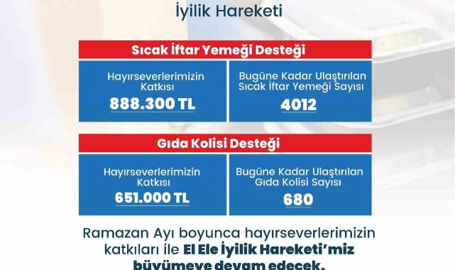 Her sene Ramazan ayına özel olarak gerçekleştirilen 'Merkezefendi El Ele İyilik Hareketi'ne hayırseverlerin bulunduğu katkı ile ihtiyaç sahiplerine sıcak iftar yemeği veya gıda kolisi ulaştırılıyor. İyilik hareketinin başladığı günden bu yana 888 bin 300 TL'lik sıcak iftar yemeği desteği, 651 bin TL'lik gıda kolisi desteğinde bulunuldu. Bugün itibariyle 4012 adet sıcak iftar yemeği ve 680 gıda kolisi ihtiyaç sahiplerine teslim edildi.