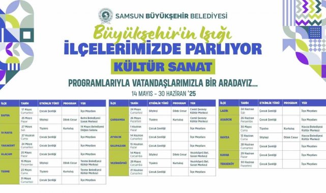 Samsun Büyükşehir Belediyesi ile kültür ve sanatın kalbi Samsun'da atmaya devam ediyor. Büyükşehir Belediyesi kültür sanat faaliyetlerini ilçelere yayıyor. 14 Mayıs Çarşamba günü başlayacak kültür-sanat şöleni, 30 Haziran'a kadar devam edecek. Samsun'un kültür-sanat zenginliğini ilçelere taşımak, her yaştan vatandaşın sanat ve eğlenceyle buluşmasını sağlamak amacı ile düzenlenen program, ilk olarak 14 Mayıs Çarşamba günü Vezirköprü ilçesi ile start alacak.