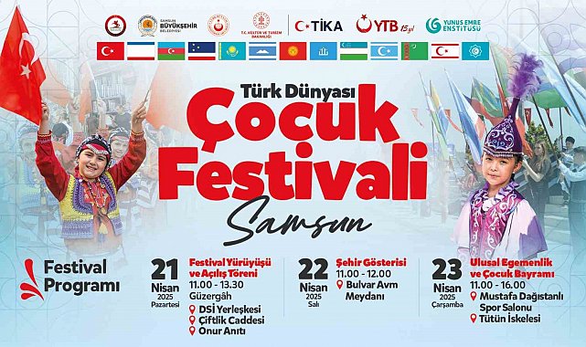 Samsun, bu yıl anlamlı ve renkli bir etkinliğe daha ev sahipliği yapmaya hazırlanıyor. Samsun Büyükşehir Belediyesi öncülüğünde Kültür ve Turizm Bakanlığı, Samsun Valiliği, Türk Dünyası Araştırma Vakfı, Türk İşbirliği ve Koordinasyon Ajansı Başkanlığı (TİKA), Yurtdışı Türkler ve Akraba Topluluklar Başkanlığı (YTB) ve Yunus Emre Enstitüsü'nün iş birliğiyle Türk Dünyası Çocuk Festivali gerçekleştiriliyor. 21-22-23 Nisan tarihlerinde, 9 farklı ülkeden gelen 124 katılımcı çocuğun bir araya geleceği festival, kültürel buluşma ve kardeşlik ruhunun en güzel örneklerinden birini oluşturacak.