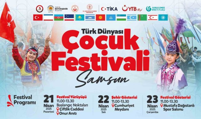 Samsun Büyükşehir Belediyesi tarafından düzenlenen Türk Dünyası Çocuk Festivali, 21-22-23 Nisan tarihleri arasında gerçekleştirilecek ve dünyanın dört bir yanından çocukları bir araya getirecek. Samsun Büyükşehir Belediye Başkanı Halit Doğan, "23 Nisan Ulusal Egemenlik ve Çocuk Bayramı'mız Samsun'umuzda dolu dolu geçecek. Tüm çocuklarımızı bu kültürel şölene davet ediyorum" dedi.