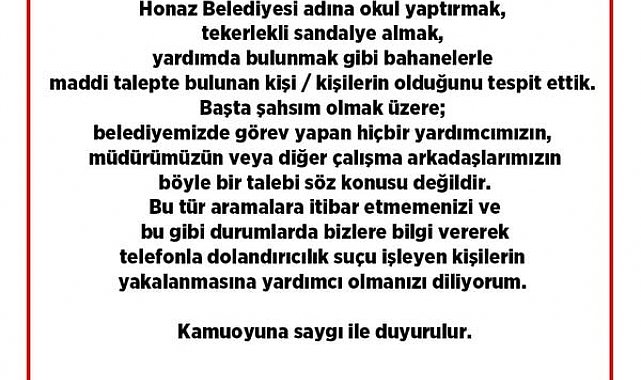 Kendilerini Honaz Belediye Başkanı Yüksel Kepenek ve belediye personeli gibi göstererek vatandaşlardan yardım parası isteyen dolandırıcılara karşı Başkan Kepenek uyarıda bulundu. Başkan Kepenek sosyal medyadan yaptığı paylaşımda, "Kendilerini şahsım olarak tanıtıp, Honaz Belediyesi adına okul yaptırmak, tekerlekli sandalye almak, yardımda bulunmak gibi bahanelerle maddi talepte bulunan kişi ve kişilerin olduğunu tespit ettik. Başta şahsim olmak üzere; belediyemizde görev yapan hiçbir yardımcımızın, müdürümüzün veya diğer çalışma arkadaşlarımızın böyle bir talebi söz konusu değildir. Bu tür aramalara itibar etmemenizi ve bu gibi durumlarda bizlere bilgi vererek telefonla dolandırıcılık suçu işleyen kişilerin yakalanmasına yardımcı olmanızı diliyorum" ifadelerini kullanarak vatandaşları uyardı.