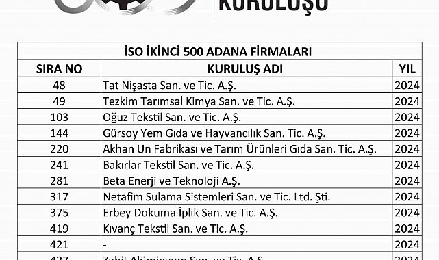 İstanbul Sanayi Odası (İSO) tarafından açıklanan "Türkiye'nin İkinci 500 Büyük Sanayi Kuruluşu-2024" araştırmasına göre Adana'dan 12 sanayi firması listeye girdi. Bu sonuçla birlikte Adana, 2024 yılı itibarıyla İSO İlk 1000 listesinde toplam 28 firma ile yer aldı.