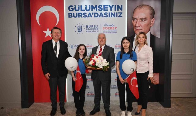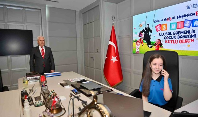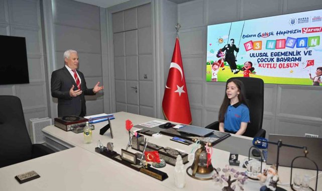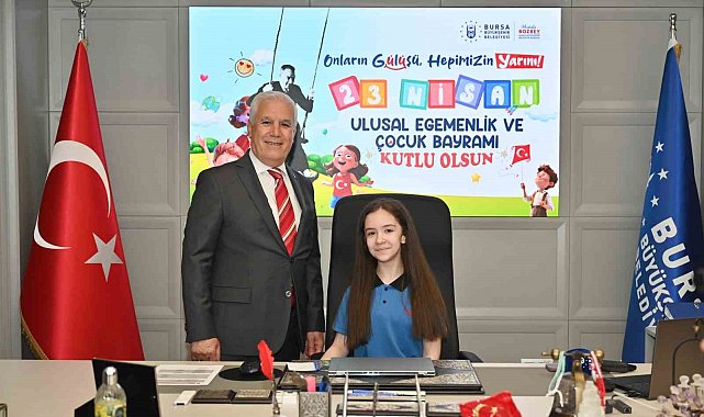 Bursa Büyükşehir Belediye Başkanı Mustafa Bozbey, 23 Nisan Ulusal Egemenlik ve Çocuk Bayramı dolayısıyla koltuğunu temsili olarak 7. sınıf öğrencileri Duru Tuna ve İlke Ormancı'ya devretti.