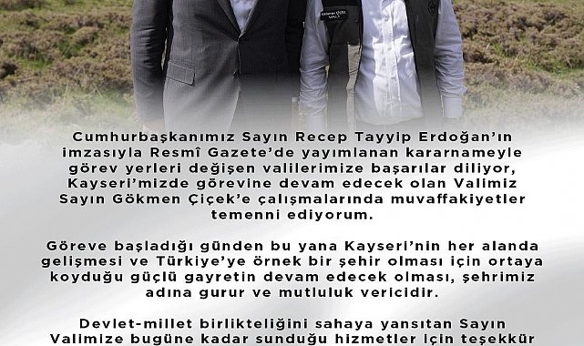 AK Parti Kayseri İl Başkanı Hüseyin Okandan, Vali Gökmen Çiçek'in Kayseri'deki görevine devam edecek olmasının ardından yaptığı açıklamada; "Göreve başladığı günden bu yana Kayseri'nin her alanda gelişmesi ve Türkiye'ye örnek bir şehir olması için ortaya koyduğu güçlü gayretin devam edecek olması, şehrimiz adına gurur ve mutluluk vericidir" dedi.