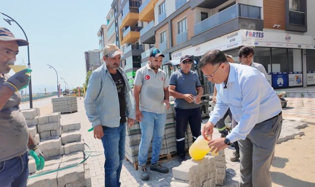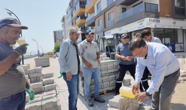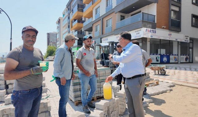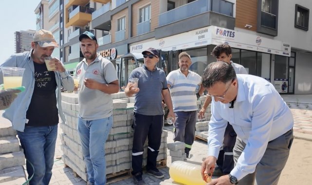 Manisa'nın Alaşehir ilçesinde Belediye Başkanı Ahmet Öküzcüoğlu, sıcak yaz günlerinde sahada görev yapan belediye personelini yalnız bırakmadı. Başkan Öküzcüoğlu, merhum babası Kahveci Nedim'in özel limonata tarifini kullanarak hazırlattığı serinletici içeceği, İstasyon Mahallesi'nde kilit parke taşı döşeyen çalışanlara kendi elleriyle ikram etti.