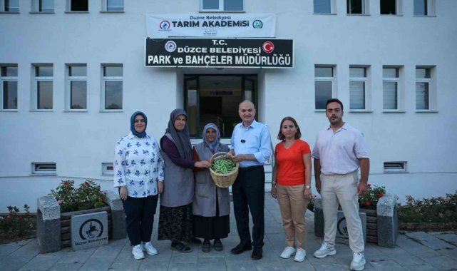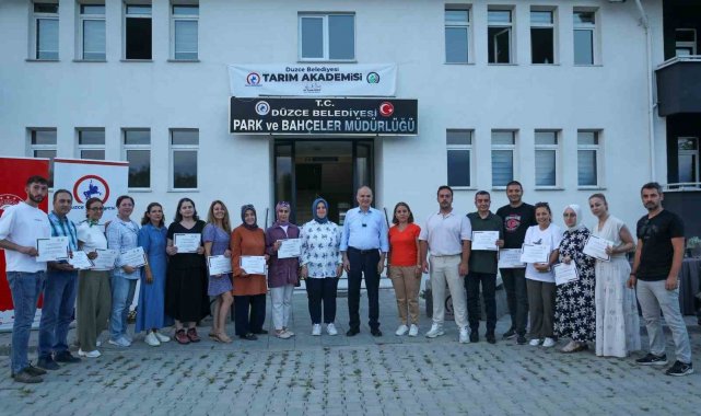 İlk hasat etkinliğine Başkan Dr. Faruk Özlü'nün yanı sıra, İl Tarım ve Orman Müdürü Esra Uzun, Park ve Bahçeler Müdürü Mücella Öztürk de katılım sağlarken, Düzce Belediyesi ile İl Tarım ve Orman Müdürlüğü iş birliğinde yürütülen "Seracılık ve Bitki Yetiştiriciliği" kursunu başarıyla tamamlayan kursiyerlere sertifikaları verildi.