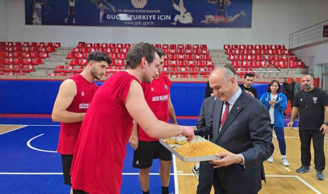 Düzce Belediye Başkanı Faruk Özlü, Türkiye Voleybol Federasyonu (TVF) Erkekler 1. Ligi'nde mücadele eden Düzce Belediyesi Spor Akademisi Voleybol Takımı'nın antrenmanına katıldı. Özlü, voleybol takımı oyuncularını Fenerbahçe SK galibiyetinden dolayı tebrik ederek baklava ikramında da bulundu.