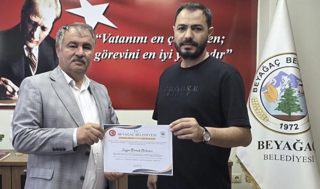 Öğrencilere verdiği emek ve Beyağaç'ın tanıtımına yaptığı katkı için Emrah Bölüm'e teşekkür eden Başkan Pütün, "Bu berat, Emrah Hocamızın Beyağaç'ımıza kazandırdığı değerli katkıların bir nişanesi olarak, gurur ve şükran duygularımızla sunulmuştur" diye konuştu.
