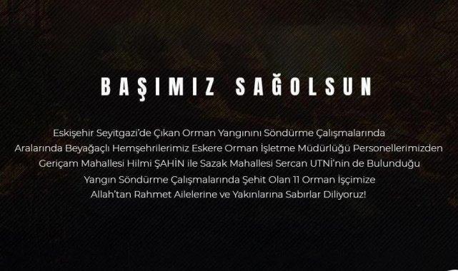 Eskişehir'in Seyitgazi ilçesinde meydana gelen orman yangınında alevlerin arasında kalarak şehit olan Beyağaçlı Orman işçileri için derin üzüntü duyduklarını belirten Beyağaç Belediye Başkanı Sazayi Pütün başsağlığı mesajı yayımladı.