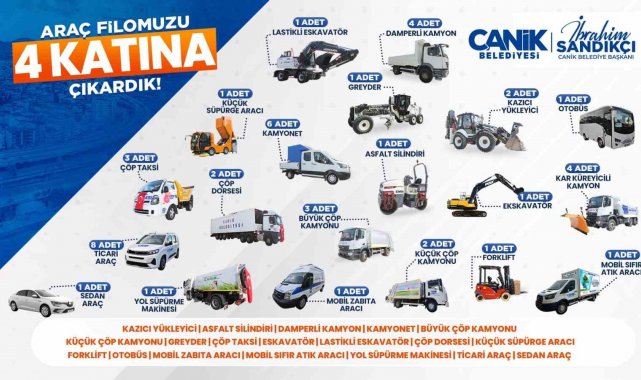 Canik Belediye Başkanı İbrahim Sandıkçı, belediyenin araç filosunu yeni araçlarla güçlendirdiklerini söyledi. Paletli ve lastikli ekskavatörlerden süpürge araçlarına, kazıcı yükleyicilerden damperli kamyonlara kadar yeni araçları belediyenin araç filosuna dahil ettiklerini ifade eden Başkan İbrahim Sandıkçı, 7 yılda araç filosunu 4 katına çıkardıklarını belirtti. Belediyenin araç filosuna yeni araçlar kazandırmaya ve araç üstü ekipman sayısını artırmaya devam ettiklerini kaydeden Başkan İbrahim Sandıkçı, son olarak sıfır kilometre ticari sınıf hizmet araçlarını araç filosuna kazandırdıklarını ifade etti.