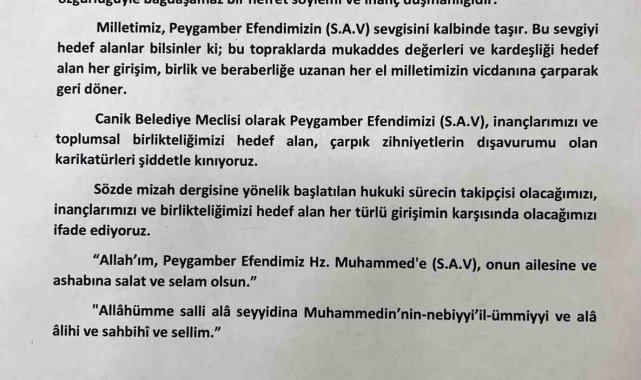 Canik Belediye Meclisi tarafından yayımlanan bildiride, yapılan karikatürlerin nefret söylemi ve provokasyon olduğu belirtilerek, "Milletimiz, Peygamber Efendimizin (Sallallahü aleyhi ve sellem) sevgisini kalbinde taşır. Bu sevgiyi hedef alanlar bilsinler ki; bu topraklarda mukaddes değerleri ve kardeşliği hedef alan her girişim, birlik ve beraberliğe uzanan her el milletimizin vicdanına çarparak geri döner. Canik Belediye Meclisi olarak Peygamber Efendimizi (Sallallahü aleyhi ve sellem), inançlarımızı ve toplumsal birlikteliğimizi hedef alan, çarpık zihniyetlerin dışavurumu olan karikatürleri şiddetle kınıyoruz. Sözde mizah dergisine yönelik başlatılan hukuki sürecin takipçisi olacağımızı, inançlarımızı ve birlikteliğimizi hedef alan her türlü girişimin karşısında olacağımızı ifade ediyoruz" ifadelerine yer verildi.