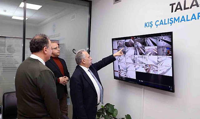 Talas'ın 22 kırsal mahallesiyle birlikte ilçe merkezindeki ana arterleri de gösteren kameraları tek tek izleyen Başkan Yalçın, sahadaki ekiplerle de canlı olarak iletişim kurarak yapılan çalışmaları denetledi.