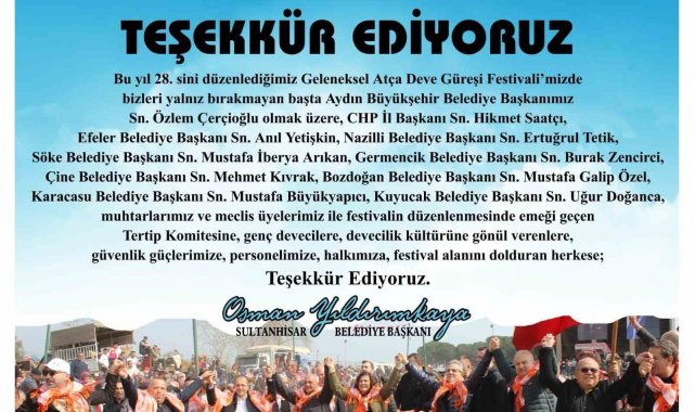 Güreşlerin ardından Sultanhisar Belediye Başkanı Osman Yıldırımkaya sosyal medya hesabından teşekkür paylaşımı yaptı. Aydın Büyükşehir Belediye Başkanı öncülüğünde tüm CHP'li ilçe belediye başkanları olan fotoğrafı 'birlikte güçlüyüz' notu ile paylaşan Başkan Yıldırımkaya şu ifadelere yer verdi; "Bu yıl 28.sini düzenlediğimiz Geleneksel Atça Deve Güreşi Festivalimizde bizleri yalnız bırakmayan başta Aydın Büyükşehir Belediye Başkanımız Özlem Çerçioğlu, CHP İl Başkanımız Hikmet Saatçı, Efeler Belediye Başkanımız Anıl Yetişkin, Nazilli Belediye Başkanımız Ertuğrul Tetik, Söke Belediye Başkanımız Mustafa İberya Arıkan, Germencik Belediye Başkanımız Burak Zencirci, Çine Belediye Başkanımız Mehmet Kıvrak, Bozdoğan Belediye Başkanımız Mustafa Galip Özel, Karacasu Belediye Başkanımız Mustafa Büyükyapıcı, Kuyucak Belediye Başkanımız Uğur Doğanca, muhtarlarımız ve meclis üyelerimiz ile festivalin düzenlenmesinde emeği geçen tertip komitesine, genç devecilere, devecilik kültürüne gönül verenlere, güvenlik güçlerimize, belediye personelimize, halkımıza ve festival alanını dolduran herkese teşekkür ediyoruz"