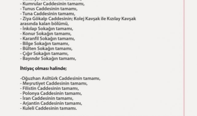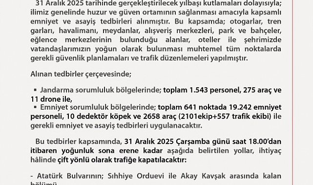 "31 Aralık 2025 tarihinde gerçekleştirilecek yılbaşı kutlamaları dolayısıyla; ilimiz genelinde huzur ve güven ortamının sağlanması amacıyla kapsamlı emniyet ve asayiş tedbirleri alınmıştır. Bu kapsamda; otogarlar, tren garları, havalimanı, meydanlar, alışveriş merkezleri, park ve bahçeler, eğlence merkezlerinin bulunduğu alanlar, oteller ile şehrimizde vatandaşlarımızın yoğun olarak bulunması muhtemel tüm noktalarda gerekli güvenlik planlamaları ve trafik düzenlemeleri yapılmıştır. Alınan tedbirler çerçevesinde; jandarma sorumluluk bölgelerinde toplam bin 543 personel, 275 araç ve 11 dron ile, emniyet sorumluluk bölgelerinde; toplam 641 noktada 19 bin 242 emniyet personeli, 10 dedektör köpek ve 2 bin 658 araç (2 bin 101 ekip + 557 trafik ekibi) ile gerekli emniyet ve asayiş tedbirleri uygulanacaktır. Bu tedbirler kapsamında, 31 Aralık 2025 Çarşamba günü saat 18.00'dan itibaren yoğunluk sona erene kadar aşağıda belirtilen yollar, ihtiyaç halinde çift yönlü olarak trafiğe kapatılacaktır. Atatürk Bulvarının; Sıhhiye Orduevi ile Akay Kavşak arasında kalan bölümü, Milli Müdafaa Caddesinin tamamı, Aşkabat Caddesinin (Bahçeli 7.Cadde) tamamı, Bestekar Caddesinin tamamı, Kızılırmak Caddesinin tamamı, Olgunlar Caddesinin tamamı, Selanik Caddesinin tamamı, Tunalı Hilmi Caddesinin tamamı, Azerbaycan Caddesinin (Bahçeli 3.Cadde) tamamı, Yüksel Caddesinin tamamı, Sakarya Caddesinin tamamı, Kumrular Caddesinin tamamı, Tunus Caddesinin tamamı, Tuna Caddesinin tamamı, Ziya Gökalp Caddesinin; Kolej Kavşak ile Kızılay Kavşak arasında kalan bölümü, İnkılap Sokağın tamamı, Konur Sokağın tamamı, Karanfil Sokağın tamamı, Bilge Sokağın tamamı, Bülten Sokağın tamamı, Çığır Sokağın tamamı, Bayındır Sokağın tamamı, ihtiyaç olması halinde; Oğuzhan Asiltürk Caddesinin tamamı, Meşrutiyet Caddesinin tamamı, Filistin Caddesinin tamamı, Polonya Caddesinin tamamı, İran Caddesinin tamamı, Arjantin Caddesinin tamamı, Kuleli Caddesinin tamamı, vatandaşlarımızın herhangi bir mağduriyet yaşamamaları adına trafiğe kapatılacak yolları dikkate almaları ve mümkün olduğunca toplu taşıma araçlarını kullanmaları önemle rica olunur. Tüm vatandaşlarımıza huzur ve güven içinde bir yılbaşı diliyor; sağlıklı, mutlu ve esenlik dolu bir yeni yıl temenni ediyoruz."
