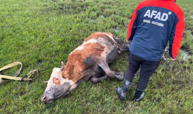 AFAD ekipleri tarafından bataklıktan çıkarılan inek, sahibine teslim edildi.