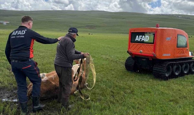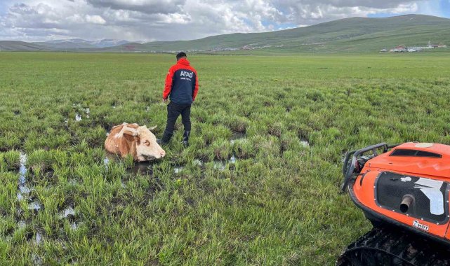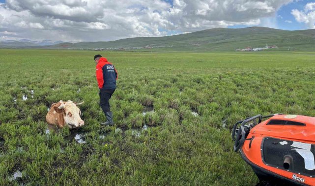 Ardahan merkeze bağlı Büyük Sütlüce köyünde meraya otlatılmaya bırakılan ineklerden 1'i bataklığa saplandı. İneğin çamura saplandığını gören köylüler, 112 Çağrı Merkezinden yardım istedi.