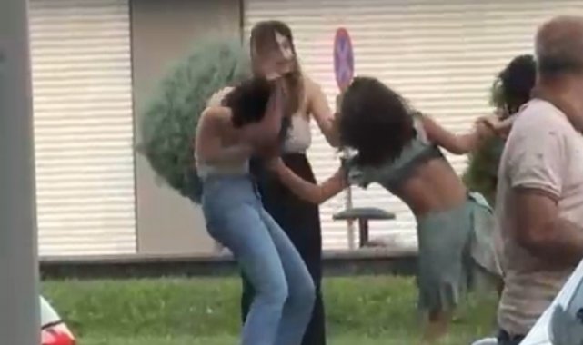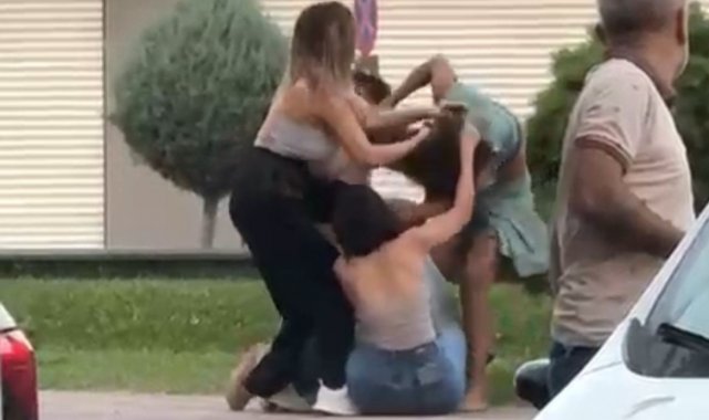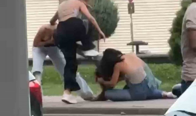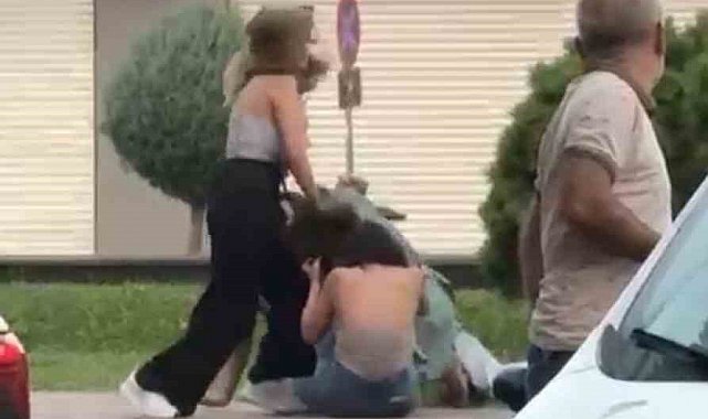 Bir türlü ayrılmayan kadınları çevredeki erkekler güçlükle ayırdı. O anlar, cep telefonu kamerasıyla kaydedildi.