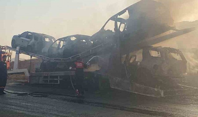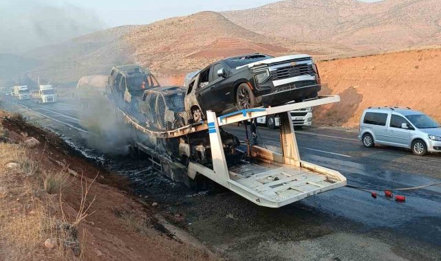 Batman'da sıfır kilometre 5 lüks araç, yüklü olduğu tırla yanarak hurdaya döndü