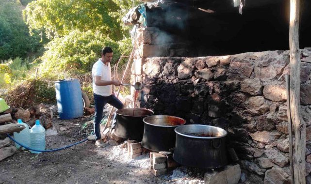 Bağ bozumu ile birlikte bahçelerindeki üzümleri toplayan üreticiler, ayaklarıyla sıktıkları üzüm şırasını yan yana dizdikleri büyük kazanlara koyarak 3 gün boyunca meşe odunu ateşi ile kaynatıp, pekmeze dönüştürüyor