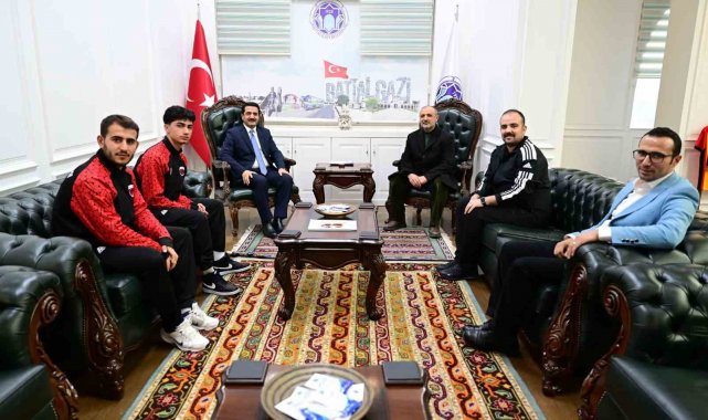 Battalgazi Belediyespor'da forma giyen ve milli takımlara seçilen futsal sporcuları Salih Öndüç ve Yusuf Efe Ataş, Battalgazi Belediye Başkanı Bayram Taşkın'ı ziyaret etti.