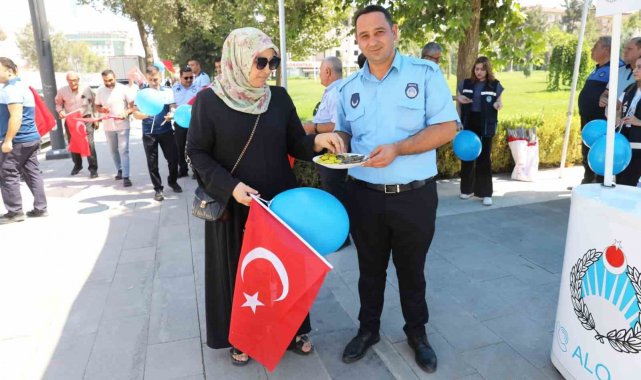 Belediye hizmet binası önünde düzenlenen etkinlikte, Battalgazi Belediyesi Zabıta Müdürlüğü ekipleri vatandaşlarla bir araya geldi. Çocuklara balon, yetişkinlere çikolata ikram edilirken, dağıtılan Türk bayraklarıyla da milli birlik ve beraberlik vurgusu yapıldı.