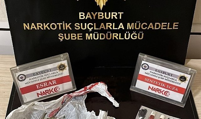 Bayburt İl Emniyet Müdürlüğü Narkotik Suçlarla Mücadele Şube Müdürlüğü görevlilerince narkotik madde kullanımı, imal ve ticaretinin önlenmesi amacıyla yapılan saha ve analiz çalışmaları sonucunda durdurulan araç ve içerisinde bulunan A.T ve H.Ç isimli şahıslar üzerinde yapılan adli aramada bir miktar esrar ve sentetik ecza maddesi ele geçirildi. Şüpheli şahıslar hakkında 'Uyuşturucu veya Uyarıcı Madde Kullanmak' suçundan adli işlem yapıldı.