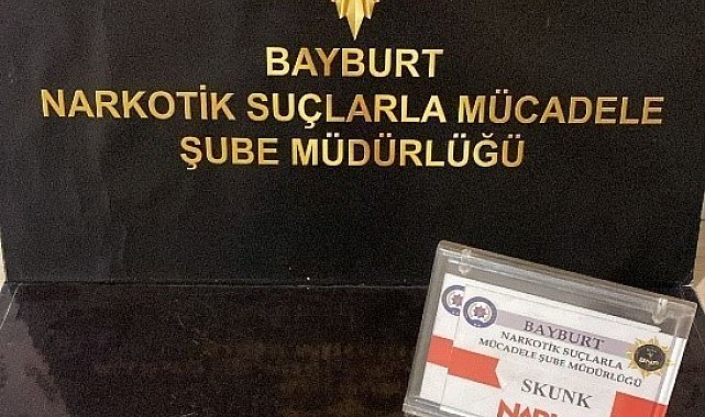 Bayburt İl Emniyet Müdürlüğü Narkotik Suçlarla Mücadele Şube Müdürlüğü görevlilerince durdurulan araçta bulunan S.B ve M.B isimli şahıslar üzerinde adli arama yapıldı. Şüphelilerin üzerinde bir miktar skunk maddesi bulundu. Uyuşturucu maddeye ekiplerce el konulurken, şüpheli şahıslara Uyuşturucu veya Uyarıcı Madde Kullanmak suçundan adli işlem uygulandı.